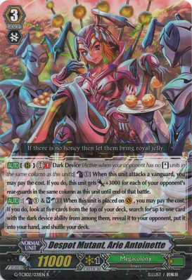 Along with our vanguard DarkfaceDespot Mutant, Arie Antoinette is a good unit to make poweful attacks even more if you have Scarlet Venom boosting this unit and the another unit with Dark Device, Superior Mantis with the ability to prevent one of your opponent’s unit to stand next turn. Darkface our main card here, allows us to paralyze 2 units and if they are not completely removed at end of turn gives us a draw, also has a very interesting the GB2 which allows us to paralyse  a rearguard for Soulblast[2] something very useful if you have a few cards in your hand.