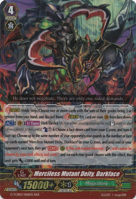 Intimidating Mutant, Darkface is the avatar of Sousuke Wakamizu from CF Vanguard G, This deck is focused on paralyse your opponent unit ( making them unable to stand) and getting other advantage like unable intercept or more cards draw. This time also features the new keyword ability Dark Device. A "Dark Device" ability remains active and can only be used as long as your opponent has no units in [Stand] state in the same column as your unit possessing the ability. It is also active even if your opponent has no units in the same column.