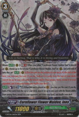 Rannuculus Flower Maiden, Ahsha is the gardener in this zone, its Stride skill ability allow us to clone a unit, its GB2 ability is also good if we want to power up our units on a set field, along with Ahsha is Innes, this unit is perfect to counter control decks because at the end of the turn you can clean up your field and also get cards with Bloom ability to hand.