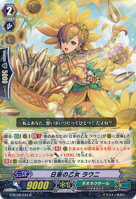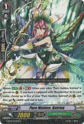 Ranunculus Flower Maiden, Asha, is the avatar of Anjou Tokoha from CF Vanguard G this season (Stride Gate), this deck is based on using Bloom mechanics, the mechanics allows us to activate a skill when a card of the same name is placed in on the field.