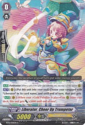 The 1st in the march is Cheer Up Trumpeter, sending this unit to soul, you can give the vanguard the skill to get power +3000 each time a rearguard is superior called from deck.
