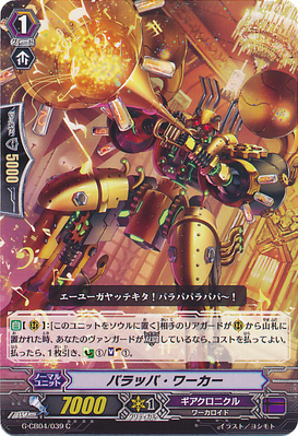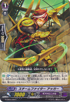 it to RG.SteamFighter, Agger is useful to get cards with the legion ability, for a soulblast, you can check the top 4 for card with this effect, Trumpeting Worker is also helpful for the countercharge[1]/soulcharge[1] when one of your opponent’s rearguard is sent to the deck.