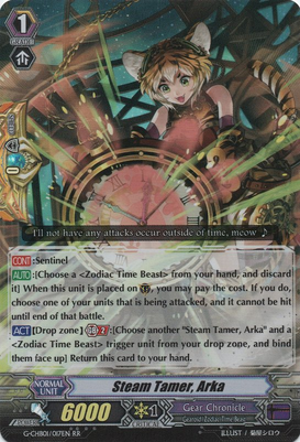 Pulsar Tamer, Nepada is a unit with the ability to intercept from the backrow and have a kind of resist when it’s at rest, Chronoethos Jackal is a Beater perfect if you want to hit your opponent before using Timeleap and Steam Tamer, Arka is the unit PG, that returns itself the hand from Drop Zone, for binding another copy and a ZTB unit.