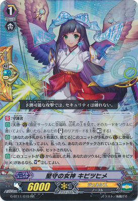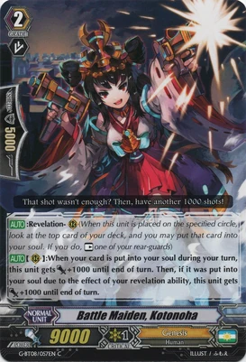 skills and also for charging your soul.Detect Angel an unit with revelation that gets [Power]+4000 when you [Rest] other rearguard by a card effect, Awanami also with revelation allow you to charge your soul when this card is soulblasted and our new PG Goddess of Adherence, Kibitsuhime that can use revelation in Guard Circle, also allow you to Soulcharge[2] if you a copy of itself in soul.